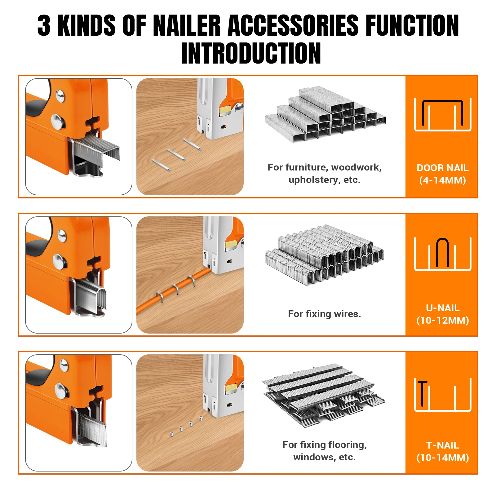 📣 3-IN-1  – For use with 3 different types of staplers/nails such as D-staples, U-staples and T-staples. It is suitable for general models: T50, T18, Brad nails with a thickness of 18. 3-in-1 Manual Stapler, great for repairing, decorating and fastening for all your everyday needs.